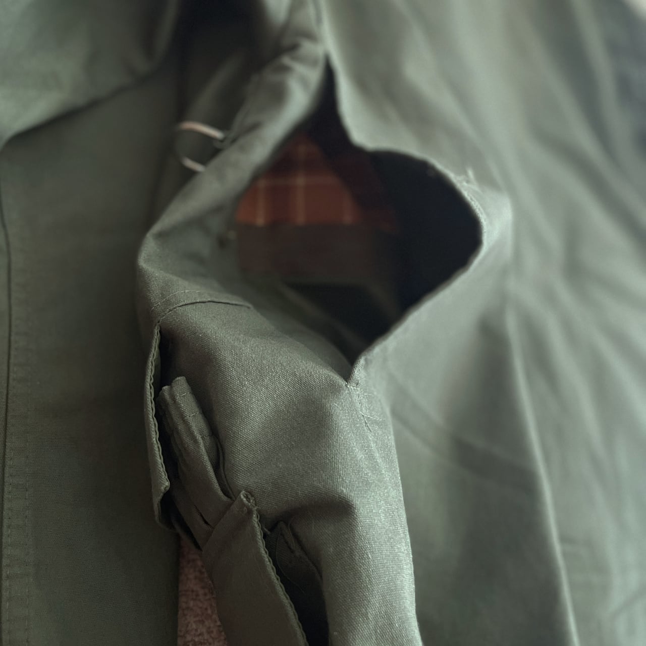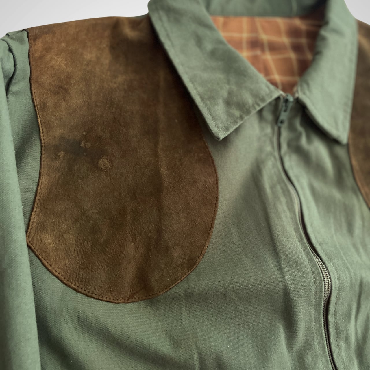深い鎌底、肩甲骨部分のアクションプリーツ、ダブルジップ、複数のポケットに、ハンティングジャケット特有のスエードのショルダーパッチや背面のゲームポケット、、、。