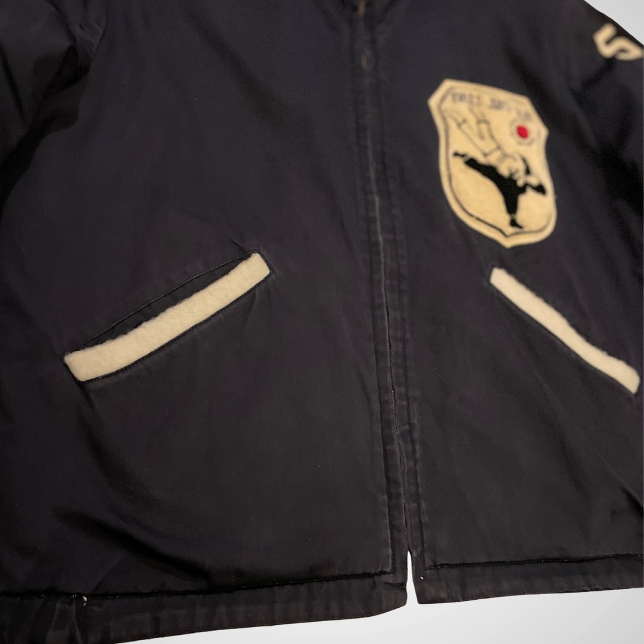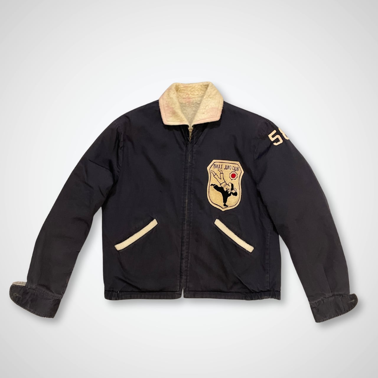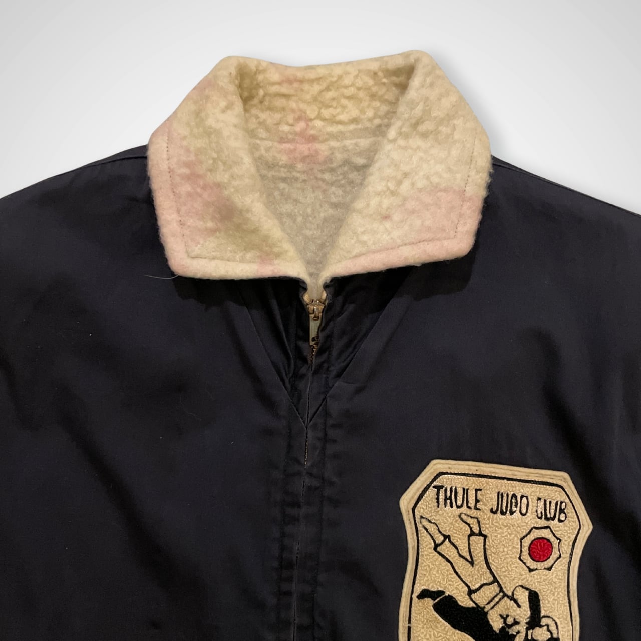 片面はネイビーの高密度のツイル地に、THULE JUDO CLUB のワッペン。