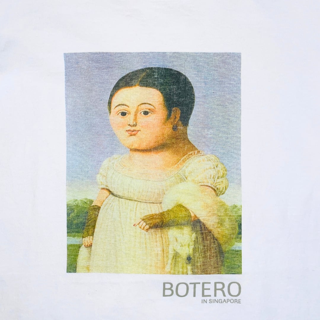 このTシャツは、シンガポールで行われたボテロの展覧会か展示会の記念Tシャツである可能性が高いです。彼の特徴的な作風を反映したこのデザインは、アート愛好者にとって魅力的なアイテムでしょう。