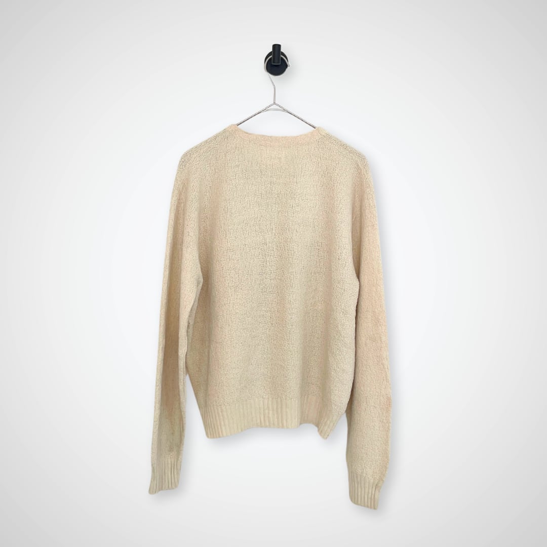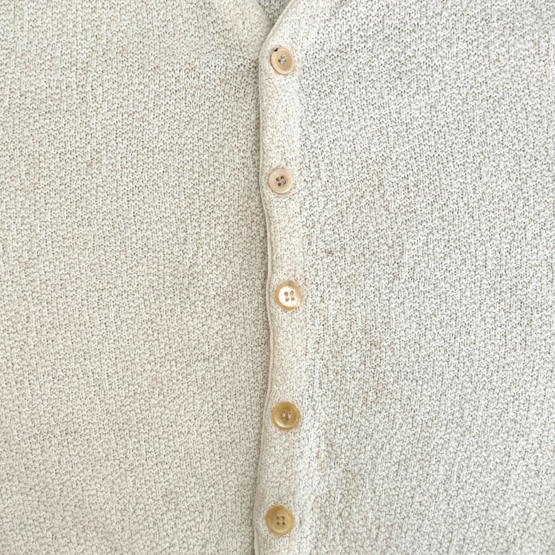シンプルで上品なデザインが特徴で、凹凸のある程よい厚みと柔らかさのある生成りカラーのニット素材。袖口や裾のリブ仕様、フロントのクラシックなボタンが、ミニマルながらも洗練された印象を与えます。