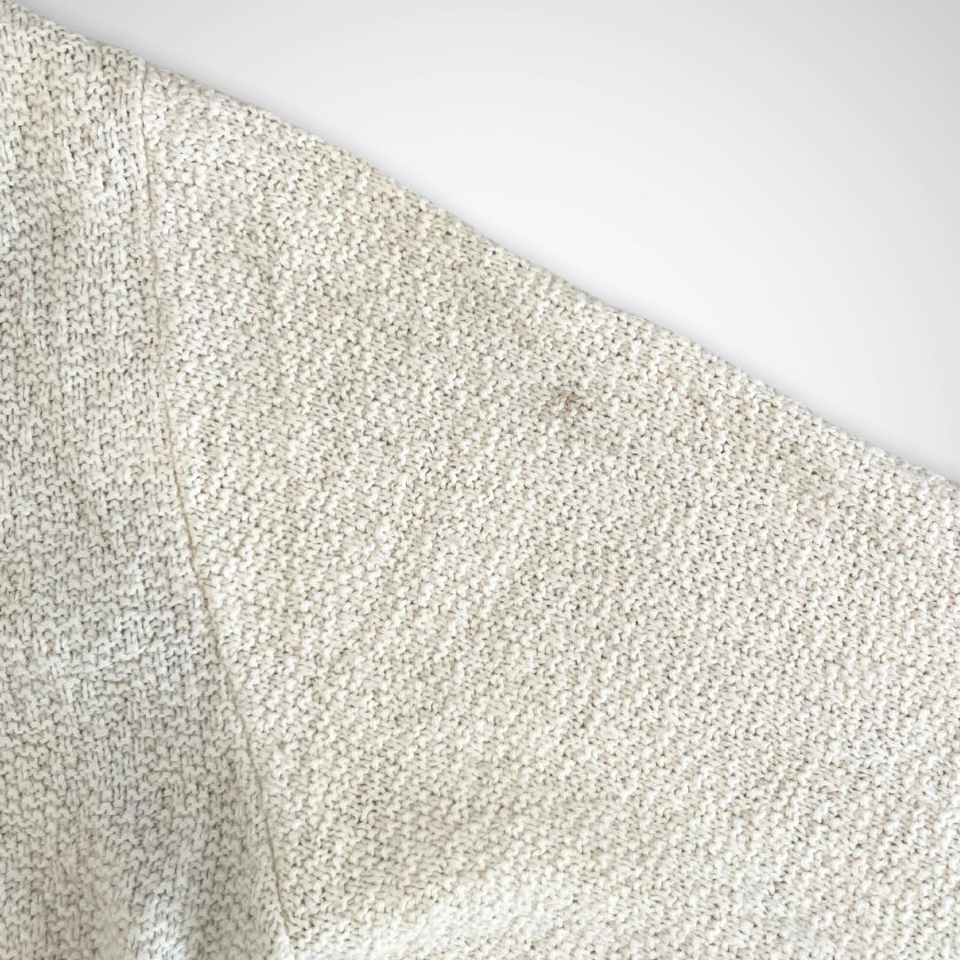 柔らかなニット素材は快適な着心地を提供し、生成りカラーのナチュラルな雰囲気は、デニムやチノパンとのカジュアルスタイルはもちろん、シャツやスラックスを合わせたドレスダウンコーデにも最適です。